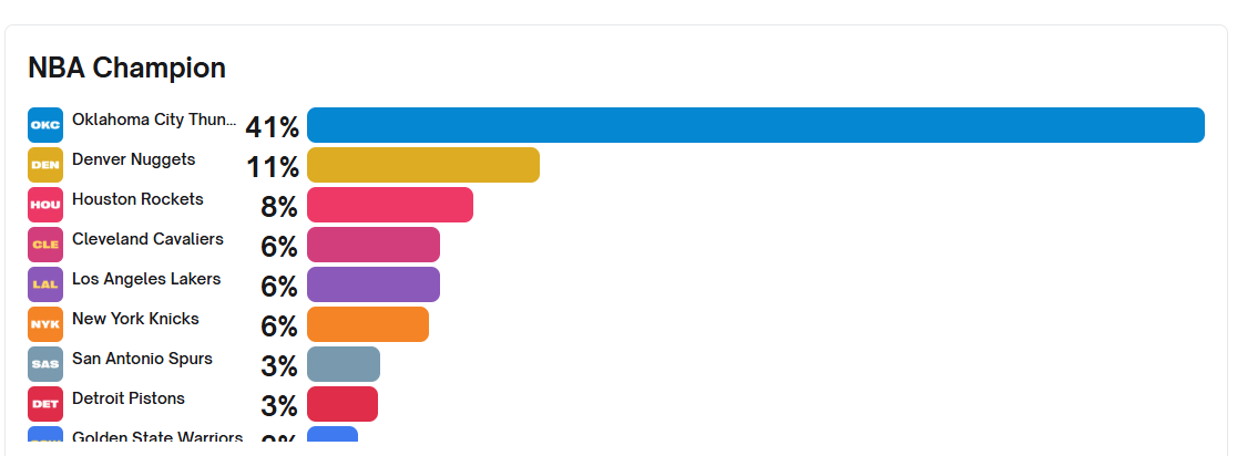 And look, we get it. They look unstoppable. Behind them, the Denver Nuggets are hovering around 11%, and the Houston Rockets—the season’s darlings—are sitting at 8%.